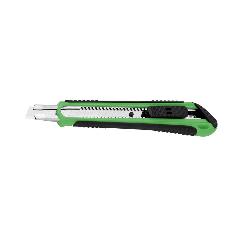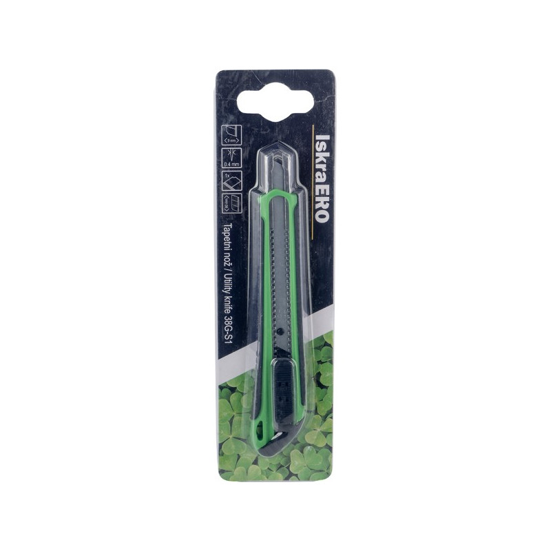 Нож со одстранливо сечило 80×9 mmЕдно сечило SK4 (со три раба за сечење)Сечило со дебелина од 0,4mmСечило со 7 делови за поретко менувањеБлокада(заклучување) на сечилото за што поголемо и попрецизно сечењеСечило од нерѓосувачки металЕргономска рачка од еластомер за удобност при употреба Пакување: блистерДимензии на блистерот (во mm): 180 (Д) x 50 (Ш) x 15 (В