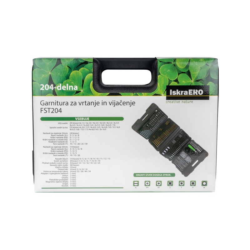 HSS сврдли (35 парчиња): 4 x 1.5 / 4 x 2.0 / 4 x 2.5 / 3 x 3.0 / 4 x 3.2 / 2 x 3.5 /3 x 4.0 / 2 x 4.5 / 2 x 4.8 ; 5.0 / 2 x 5.5 ; 6.0 / 2x 6.5 ; 7.0Спирални сврдли за дрво (32 парчиња): 4 x 3.0, 3.5 / 4 x 4.0, 4.5 / 4 x 4.8, 5.0, 5.5, 6.0 / 4 x 6.5, 6.8, 7.0, 7.5 / 4 x 8.0, 9.0 / 3 x 10.0Наставки за навртување 25mm (20 парчиња) :Рамни наставки (SL): 3 / 5 / 6 / 8Крстач наставки (PH): 0 / 1 / 2 / 3Крстач наставки со ѕвезда (PZ): 0 / 1 / 2 / 3Квадратни наставки (S): 1 / 2 / 3Torx наставки (T): 10 / 15 / 20Наставки за навртување 50mm (14 парчиња) :Рамни наставки (SL): 3 /4/ 5 / 6 / 8Крстач наставки (PH): 1 / 2 / 3Крстач наставки со ѕвезда (PZ): 1 / 2 / 3Torx наставки (T): 10 / 15 / 20Насадни клучеви (10 парчиња): 4 / 5 / 6 / 7 / 8 / 9 / 10 / 11 / 12 / 13Бургија за бетон (8 парчиња): 3 / 4 / 5 / 6 / 7 / 8 / 9 / 10Плочеста бургија за дрво (6 парчиња): 10 / 13 / 16 / 19 / 22 / 25Обични ѕидни додатоци (60 парчиња):Држач за завртки (4 парчиња)Дистанцер (4 парчиња): 3 / 6 / 8 / 10Круни за режење дупки (4 парчиња):Адаптер со клуч за затегнување (1 парче)Имбус (1 парче)Конусно глодало (1 парче)Флексибилен продолжеток (1 парче)Магнетен држач за завртки (1 парче)Штрафцигер (1 парче)Кутија (1 парче)Пакување: куферДимензии на куферот (во mm):333 (Д) x 95 (Ш) x 242 (В)